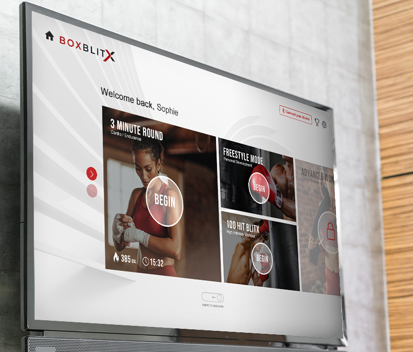 We started by analysing and testing the current functionality of the machine and the integration between the hardware and software. We then discussed, explored and scoped all of the features Blitx wanted from this equipment in their long term project. Our team worked with the equipment within our Swindon office to develop the software which has a shiny new interface, touch screen capabilities and the ability for Blitx to add new features and workouts - all of which can be controlled and updated from a virtual location. We also developed the visual design of the touch screen interface to reflect the move from video arcades to professional gyms, whilst also creating BoxBlitx their logo design and building the foundations of their brand. The next phase in this exciting project is to create an app for gym users better engage with the equipment, track their performances and interact with other users of Blitx through national leaderboards.